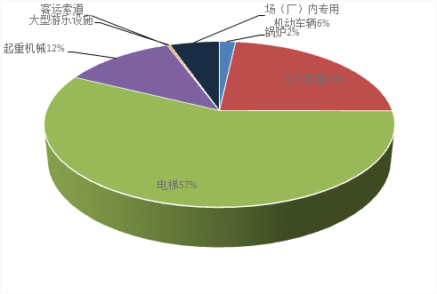 截至2020年底,全省特种设备总量达606768台(套),其中:锅炉10634台,占比2%;压力容器(不含气瓶)141558台,占比23%;起重机械73111台,占比12%;电梯347064台,占比57%;场(厂)内专用机动车辆33176台,占比6%;大型游乐设施1790台(套),占比0.29%;客运索道43条;另有气瓶528.1万只、压力管道43321.76千米。
