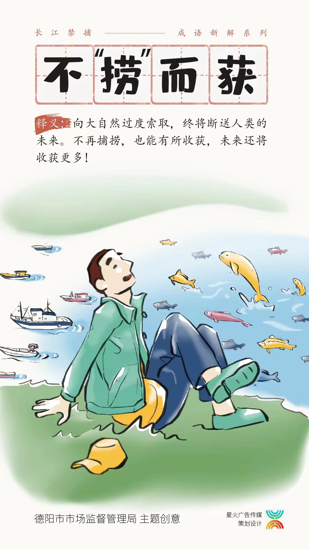 德阳市局在全市多路公交车身、公交车站牌、社区展板、门户网站等载体上宣传长江禁捕。长江禁捕成语新解系列漫画、视频,主要包含长江禁渔“八个严禁”、投诉举报热线、禁渔政策法规等内容。