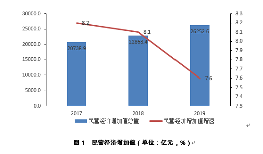 (一)民营经济规模扩大。2019年四川省民营经济增加值达到2.63万亿元,增速7.6%,高于全省GDP增速0.1个百分点。民营经济增加值占全省GDP达56.3%,较2018年提高0.1个百分点,不但实现了连续多年比重的提高,而且比重庆(52.8%)、陕西(54.6%)分别高3.5、1.7个百分点。