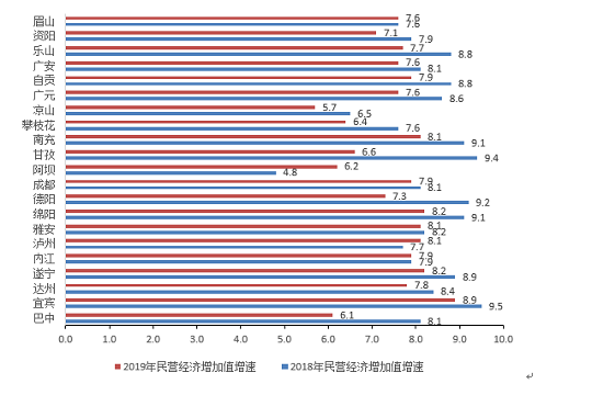 一是民营经济增速放缓。2019年全省民营经济增加值增速7.6%,同比下滑0.5个百分点。从各市州民营经济增加值增速与2018年的变化来看,2个市州上升(阿坝、泸州分别较上年增加1.4、0.4个百分点),2个市州持平(眉山和内江),其余17市州均出现不同幅度下滑,其中甘孜下滑幅度最大,较上年下降2.8个百分点;雅安下降幅度最小,较上年下降0.1百分点,反映我省民营经济增长存在一定程度的下行压力。