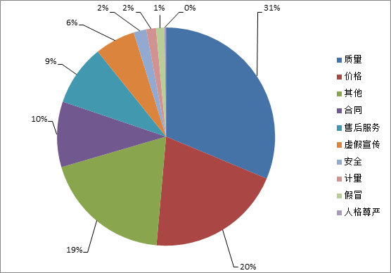 从统计数据来看,商品、服务的质量问题仍居投诉总量之首,成为消费者投诉的主要方面。与去年同期相比,售后服务方面的投诉下降趋势最为明显,价格、计量、人格尊严的投诉比例上升幅度较大(见表1)。