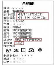 查看产品的吊牌、包装、耐久性标签上的标识信息,应至少包含厂名、厂址、产品名称、规格型号、执行标准、安全类别、羽绒种类等信息,应避免购买标识信息不全的产品。优先选购产品标准为GB/T 14272-2021的产品,婴童羽绒服还应注意是否标注GB 31701。