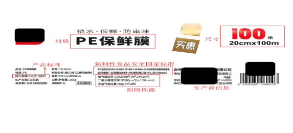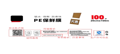 检查产品标识。注意查看生产许可证编号及生产许可证标志,产品标识包括产品名称、材质、生产者和(或)经销者的名称、地址和联系方式、生产日期和保质期、注意事项或者警示信息等内容。执行标准应符合GB 4806.7—2023(食品安全国家标准 食品接触用塑料材料及制品),产品标准为GB/T 10457—2021 (食品用塑料自粘保鲜膜质量通则)或企业标准。