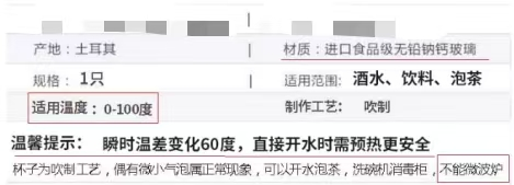 使用前,要详细阅读产品说明书及警告标识信息,尤其是玻璃杯的最高使用温度、盛装液体种类等事项,以免发生烫伤或划伤等伤害。